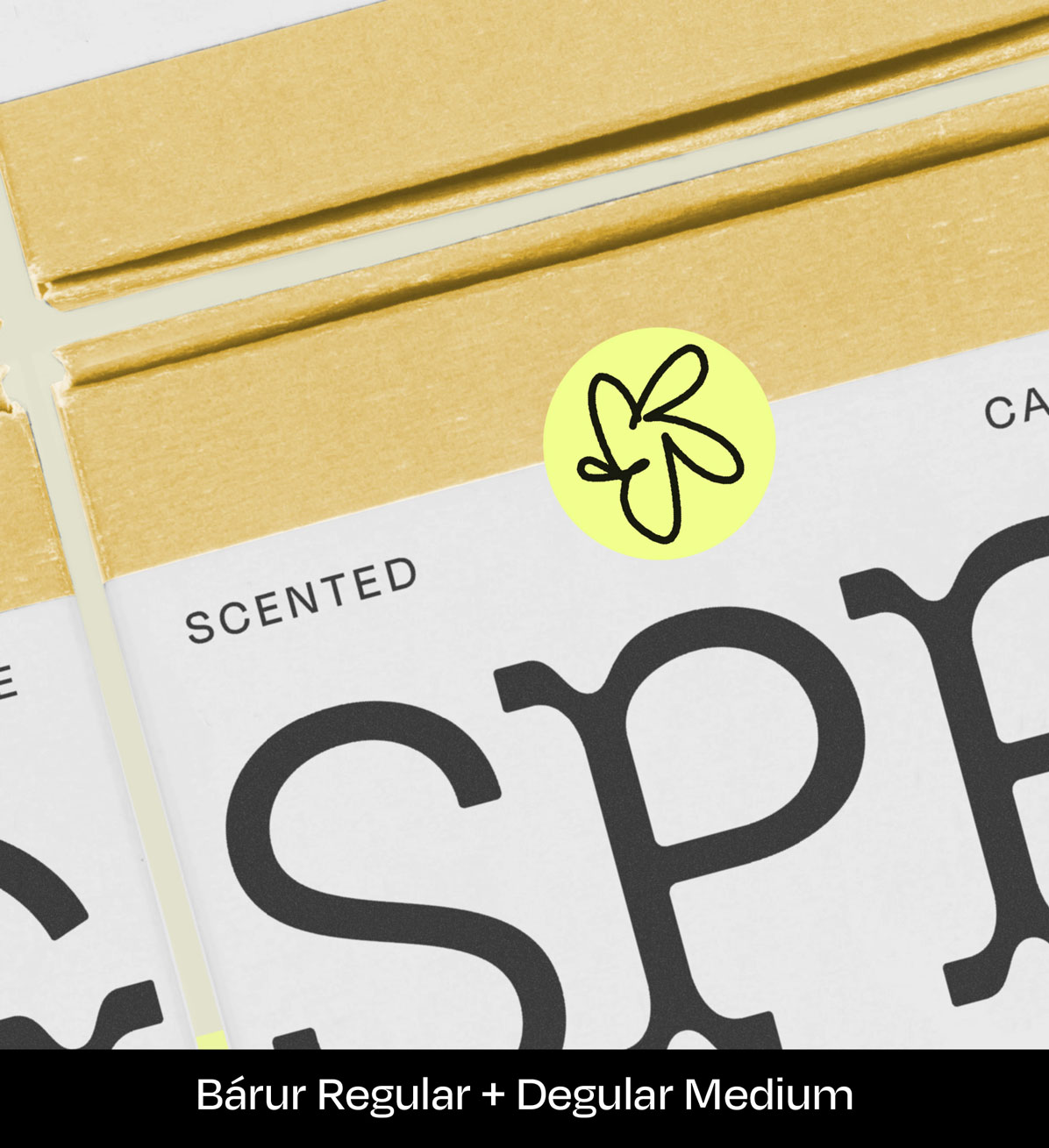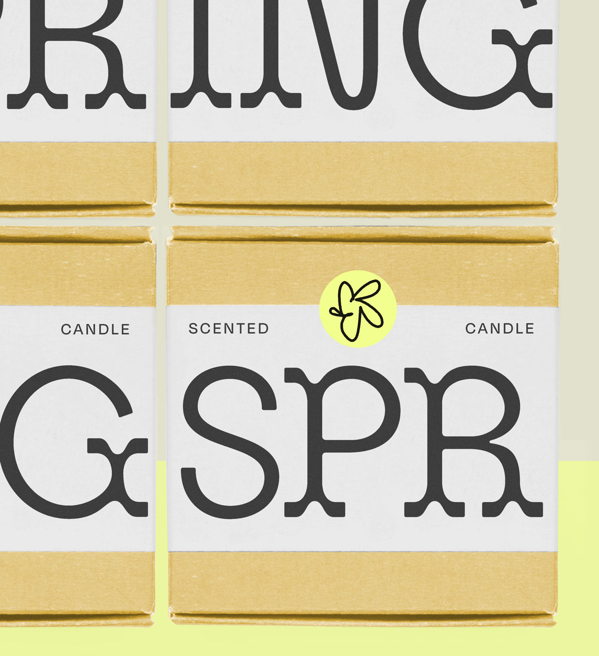 The color yellow is another key factor for this candle packaging, as is the little flower icon, but today, the focus is type. The candle name SPRING wraps around the carton in an oversized layout, revealing itself only when multiple packages are placed side by side. This creates a playful shelf presence and makes Bárur feel noticeably younger than in previous examples.