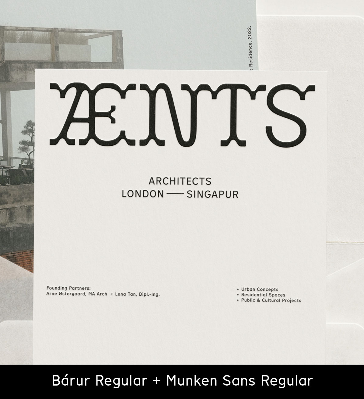 As a display typeface, Bárur is a fitting choice for a brand or logo type for an architecture firm. Designed to echo movement and structure, it combines clarity with character. For the ÆNTS Architects mark, it balances bold precision with refined personality. Flowing forms rooted in geometry.