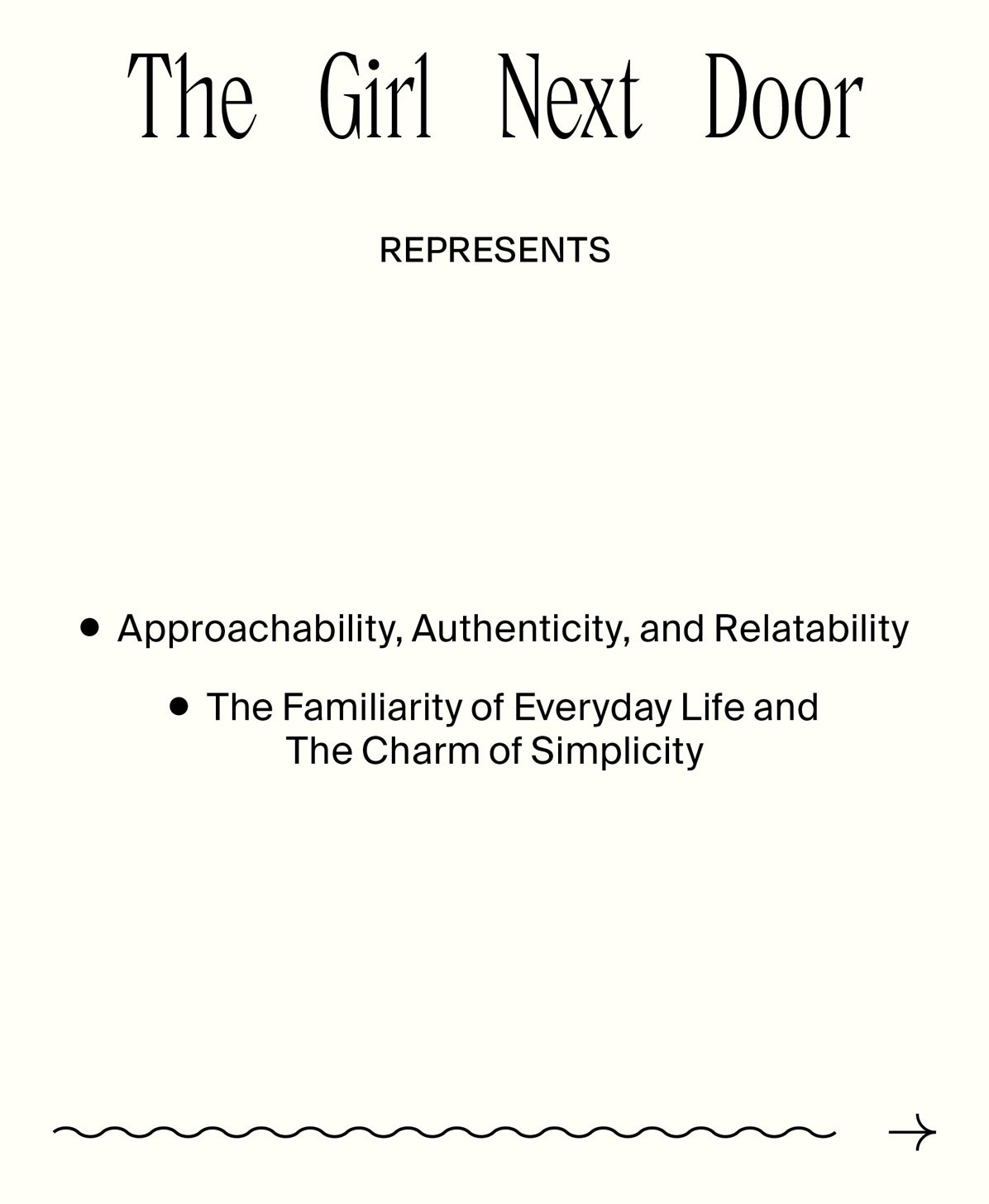 The Girl Next Door embodies approachability, authenticity, and relatability. She represents the familiarity of everyday life and the charm of simplicity.