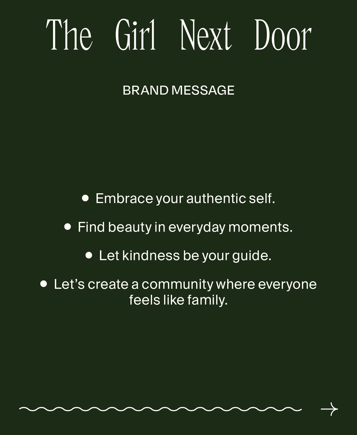Brand Message: »Embrace your authentic self. Find beauty in everyday moments. Let kindness be your guide. Let’s create a community where everyone feels like family.«